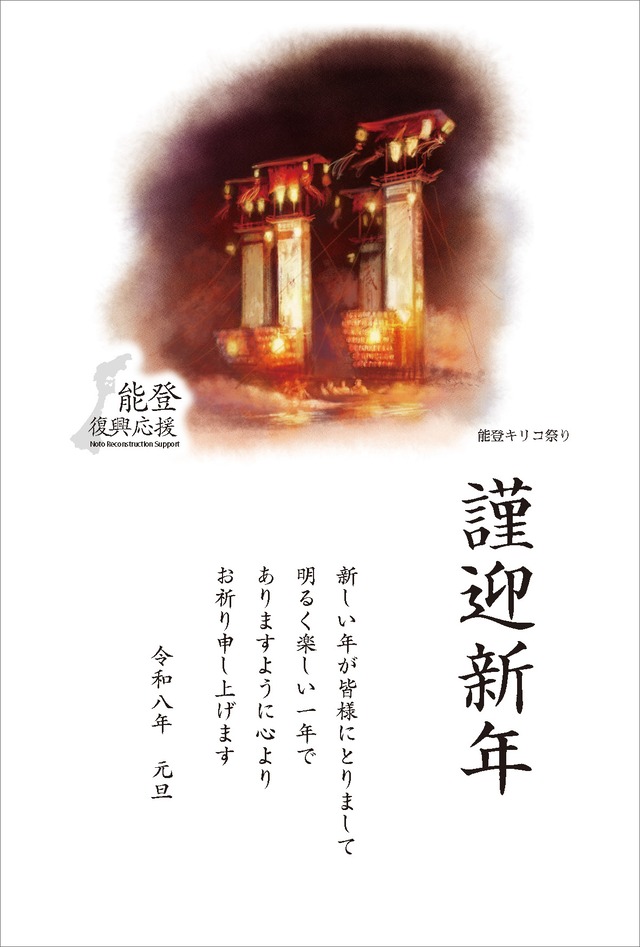 能登の美しい風景や歴史ある文化を年賀状を通して多くの方に知ってもらいたい。そんな思いがこめられています。大切なあの人に、特別な年賀状を送ってみませんか。 能登キリコ祭り 令和8年[午年]2026年 年賀状 ● 郷土の親しみある風景や伝統など日本のふるさとをテーマとし、優雅に美しくデザインされた「ふるさと年賀状 雅」。今年は、石川県能登半島をメインに、年賀はがきにデザインしました。 ● ふるさと年賀雅シリーズのパック売り年賀状は、売り上げの一部を義援金として被災地に寄付いたします。 ●「雅」シリーズ画家 井上栄一(油彩画家 / 金沢市在住) 仕 様 お年玉付き年賀はがき 枚 数 同デザイン 4枚1パック