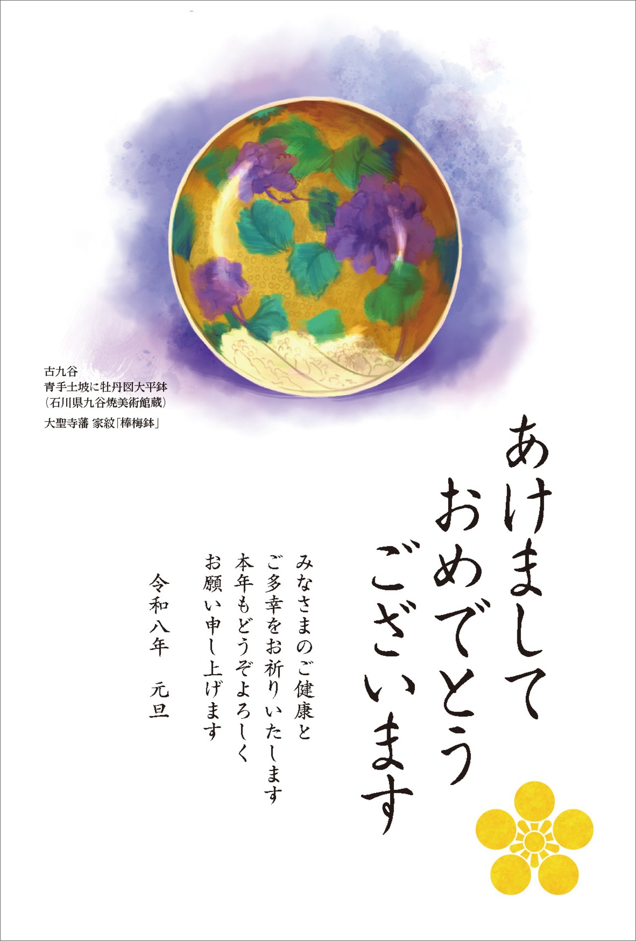 ● 古九谷 青手土坡に牡丹図大平鉢(石川県九谷焼美術館蔵 大聖寺藩 家紋「棒梅鉢」)